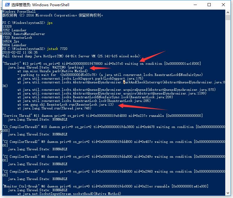 可以看到Thread-1处于waiting状态一直在等在某种条件,就是等待另一个线程释放锁。