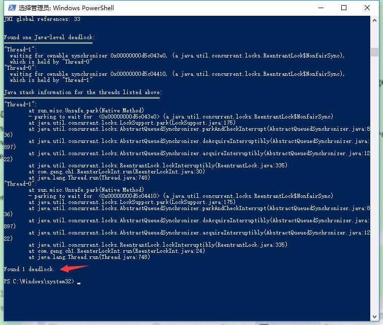 上面这段代码,发生了死锁,程序无法正常结束。通过jstack可以看到发现了一个死锁。